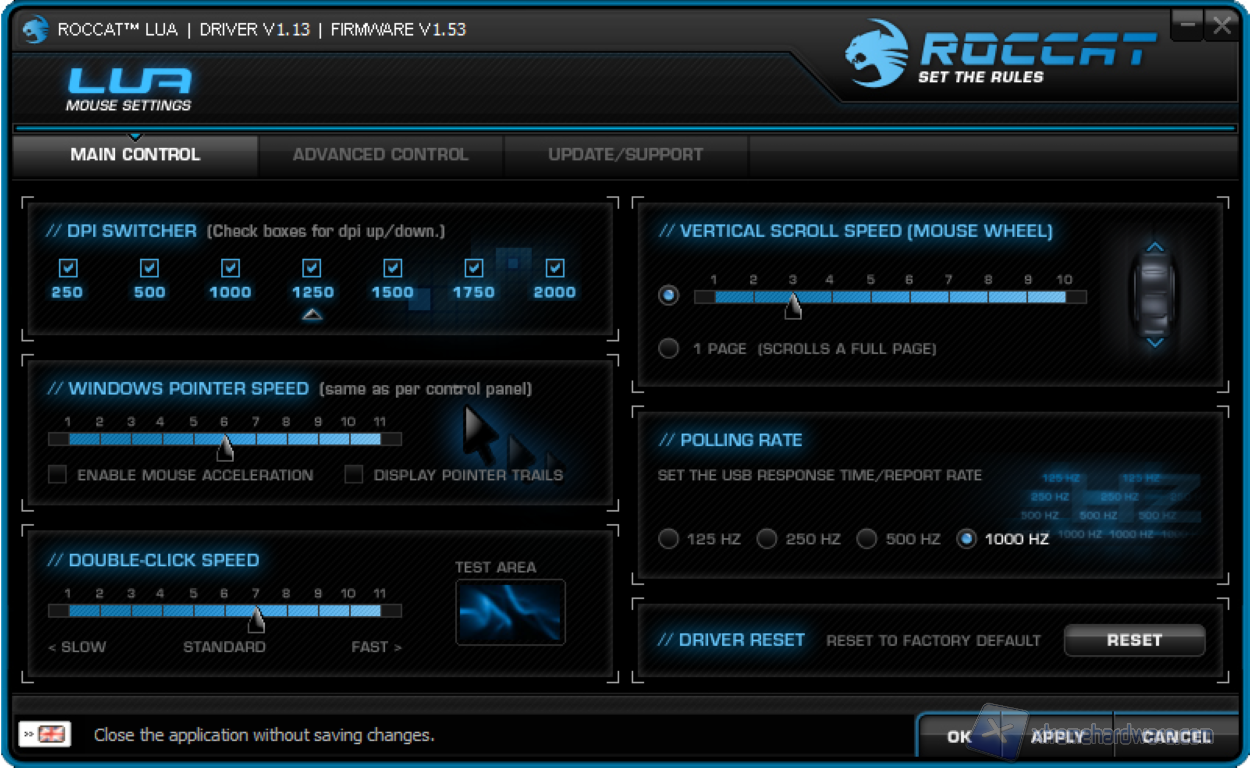I driver sono disponibili solamente sul sito Roccat in quanto non viene fornito il CD a corredo. La nostra versione di driver è la 1.13.