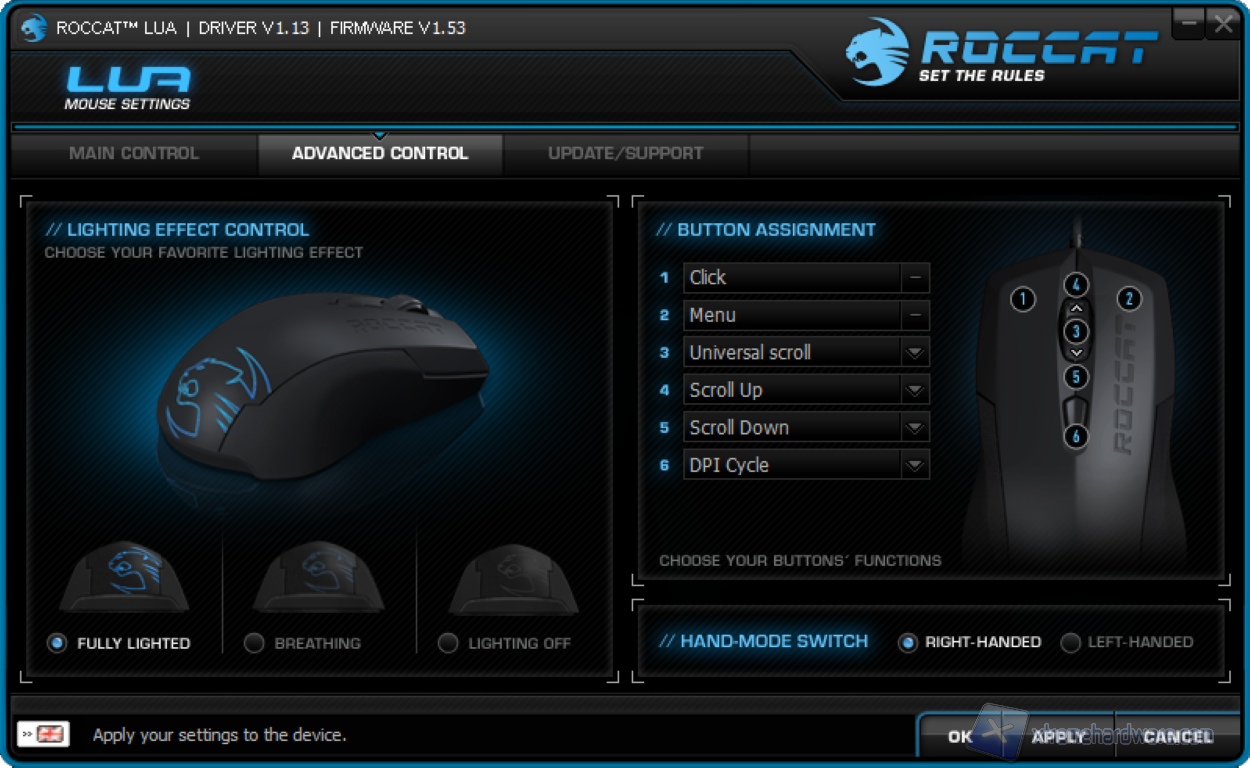 Scorrendo fino al secondo menù, chiamato Advanced Control, ci troviamo davanti le impostazioni dell’illuminazione, l’assegnazione dei tasti e il tipo di impugnatura con cui prendiamo il mouse in modo che i tasti cambino automaticamente in caso fossimo mancini o destri.