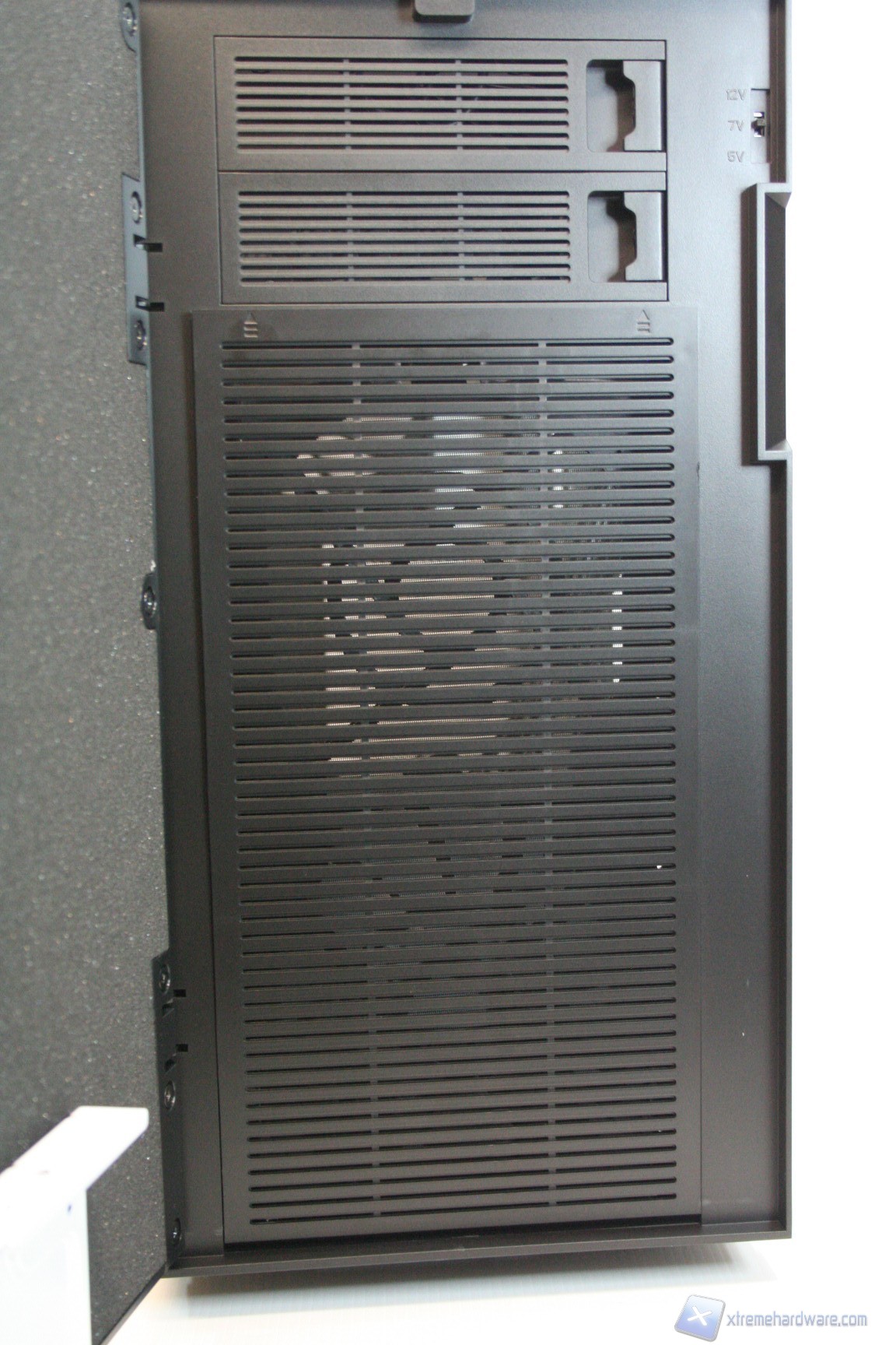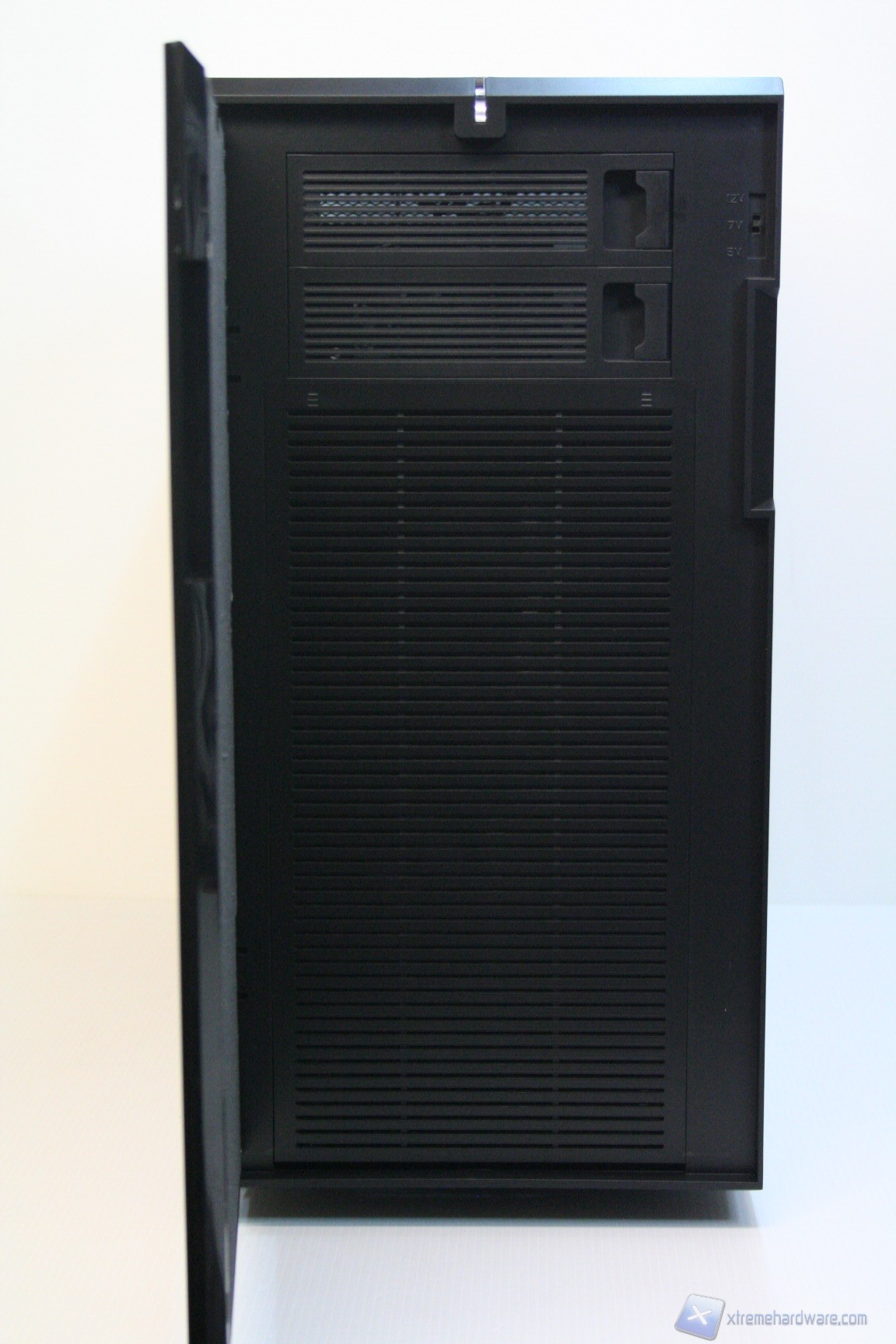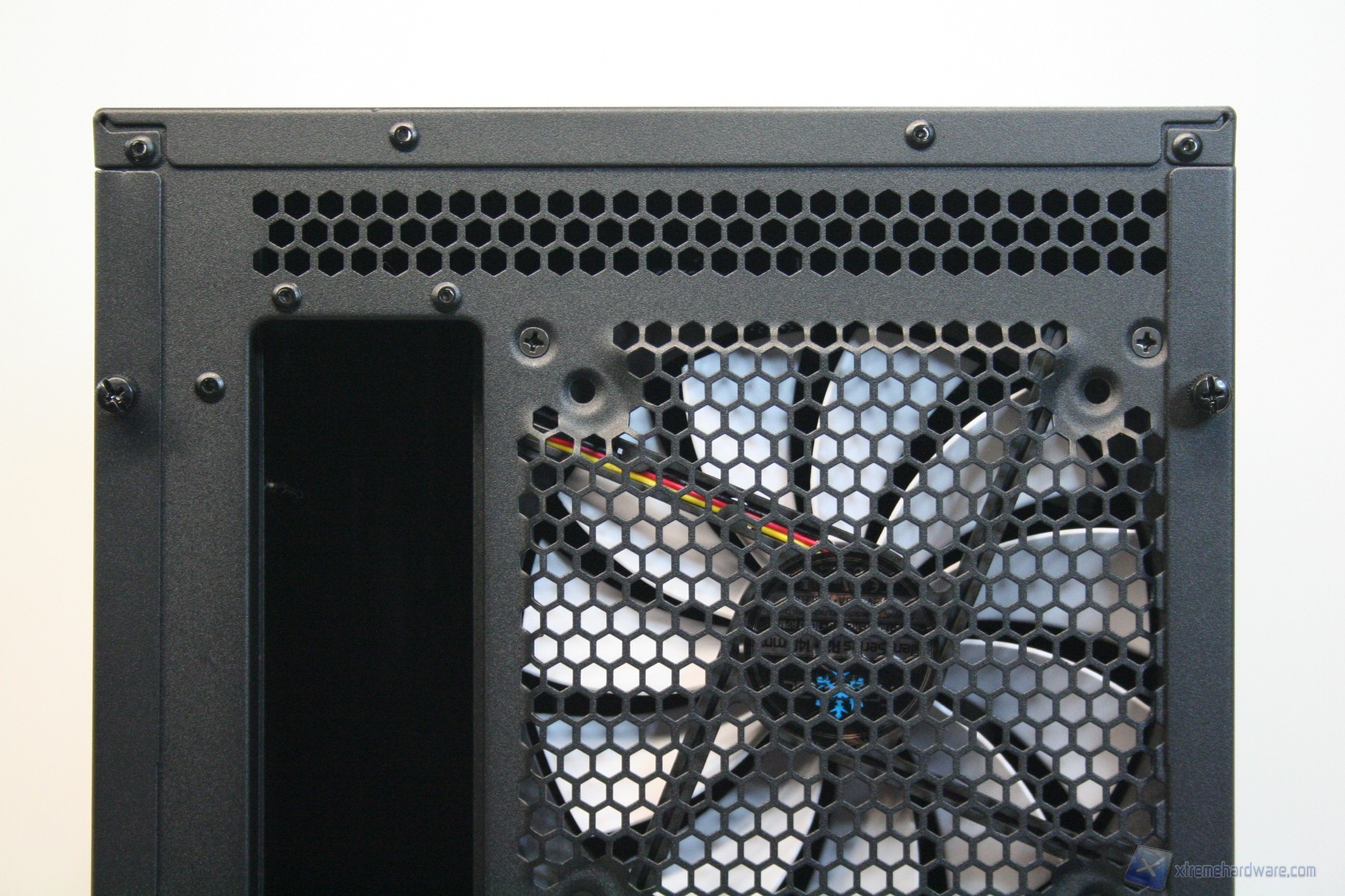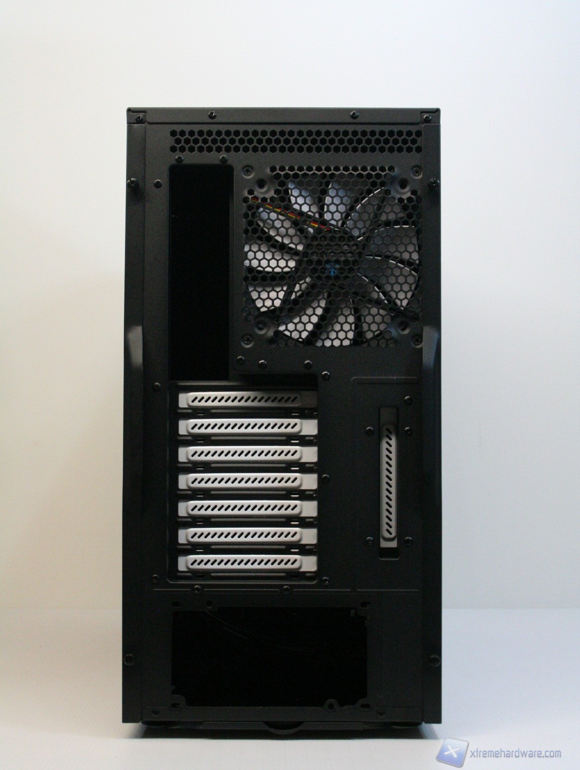 Posteriormente abbiamo una classica configurazione con alimentatore nella parte inferiore, slot di espansione che presentano aperture d’aerazione, e una paratia perforata di aerazione laterale ovvero nient’altro che un ulteriore slot PCI, per i tipici add-on come ulteriori porte USB o potenziometri per ventole. Sono assenti i fori circolari gommati per il passaggio dei cavi di sistemi a liquido però è presente uno spazio superiore con fessure esagonali che permette l’espulsione dell’aria calda superiore. La ventola è maggiorata, da 140mm, ed è posizionata in modo classico. E’ ovviamente presente la classica copertura antistatica I/O verticale. Lo spessore del cabinet è eccellente e solo questo si meriterà mezzo punto nella valutazione finale, perché è di fondamentale importanza nei cabinet moderni, per diverse ragioni: