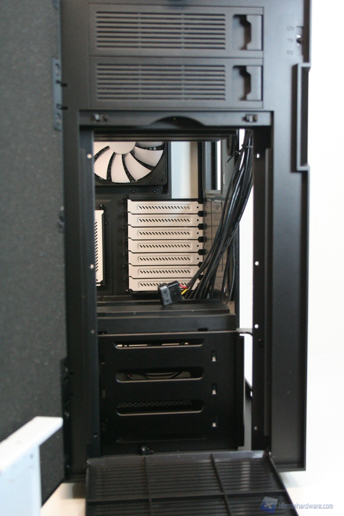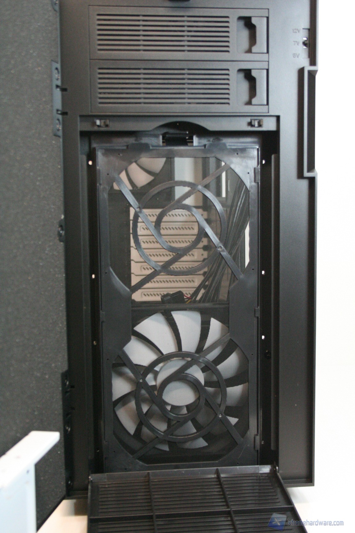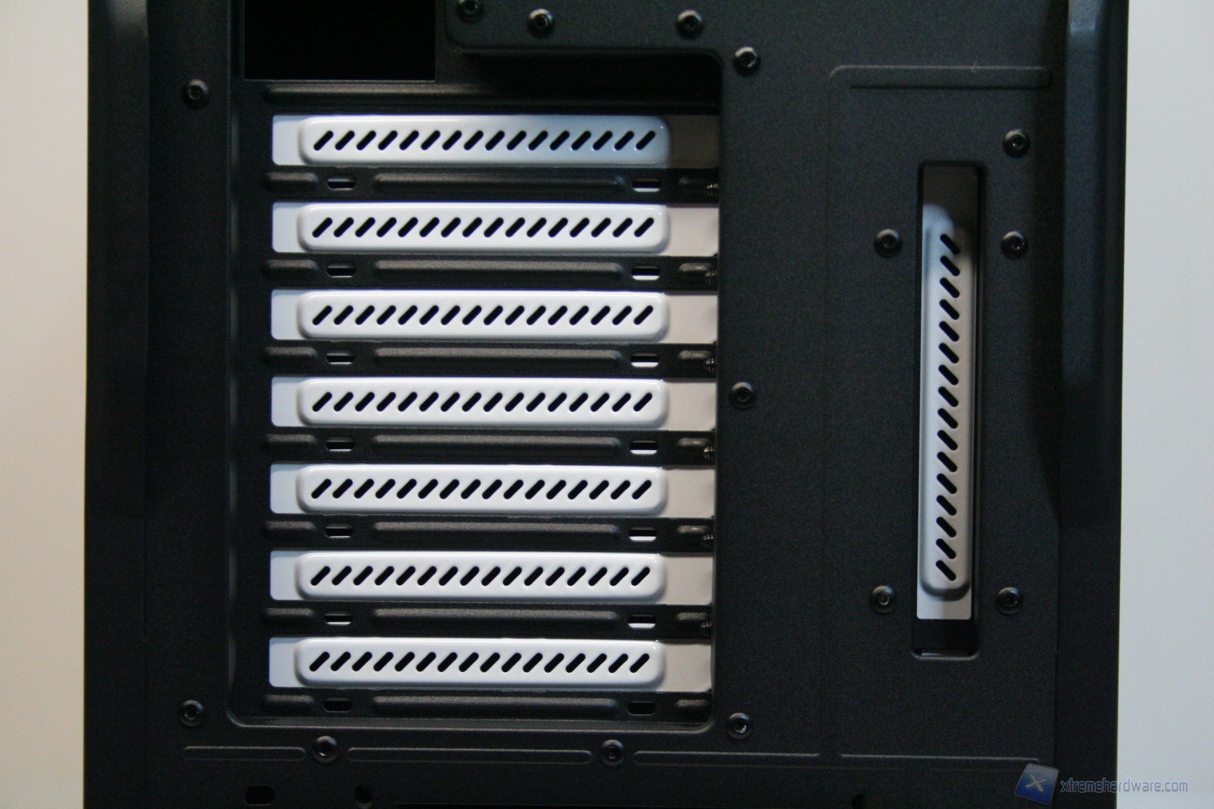 Posteriormente abbiamo una classica configurazione con alimentatore nella parte inferiore, slot di espansione che presentano aperture d’aerazione, e una paratia perforata di aerazione laterale ovvero nient’altro che un ulteriore slot PCI, per i tipici add-on come ulteriori porte USB o potenziometri per ventole. Sono assenti i fori circolari gommati per il passaggio dei cavi di sistemi a liquido però è presente uno spazio superiore con fessure esagonali che permette l’espulsione dell’aria calda superiore. La ventola è maggiorata, da 140mm, ed è posizionata in modo classico. E’ ovviamente presente la classica copertura antistatica I/O verticale. Lo spessore del cabinet è eccellente e solo questo si meriterà mezzo punto nella valutazione finale, perché è di fondamentale importanza nei cabinet moderni, per diverse ragioni: