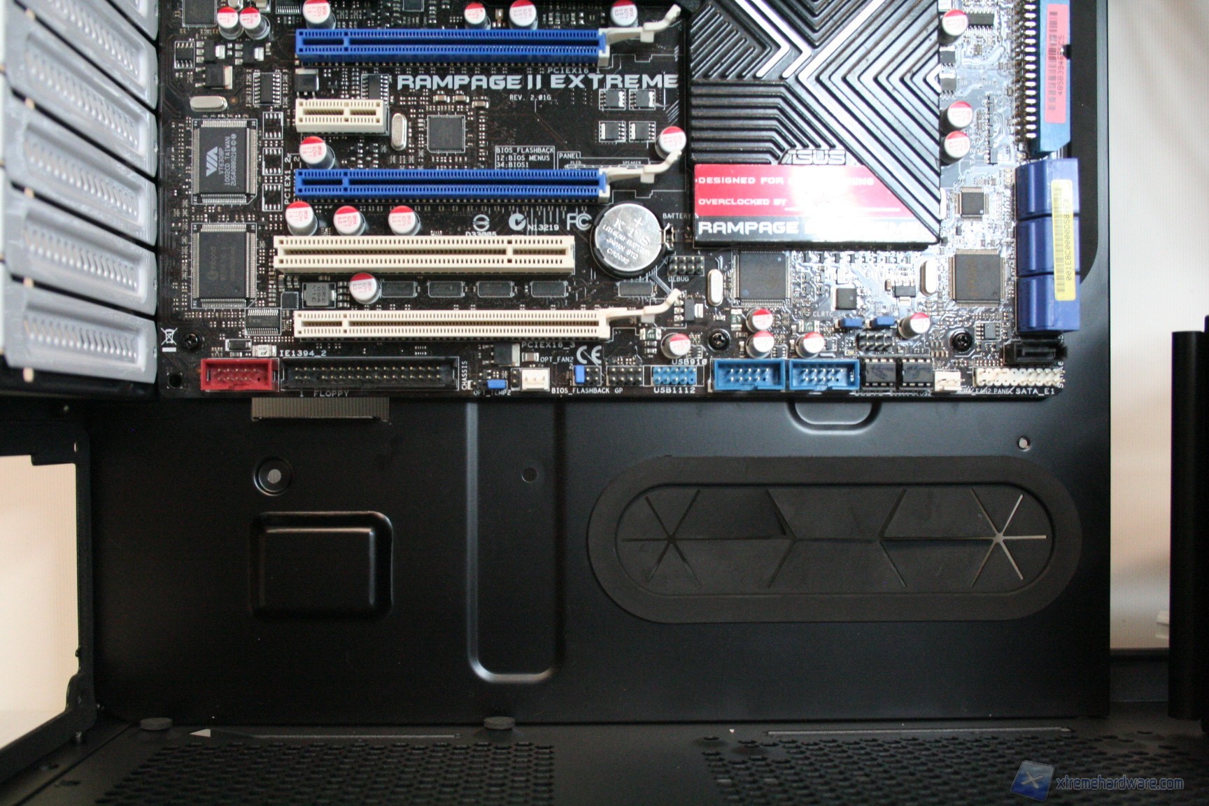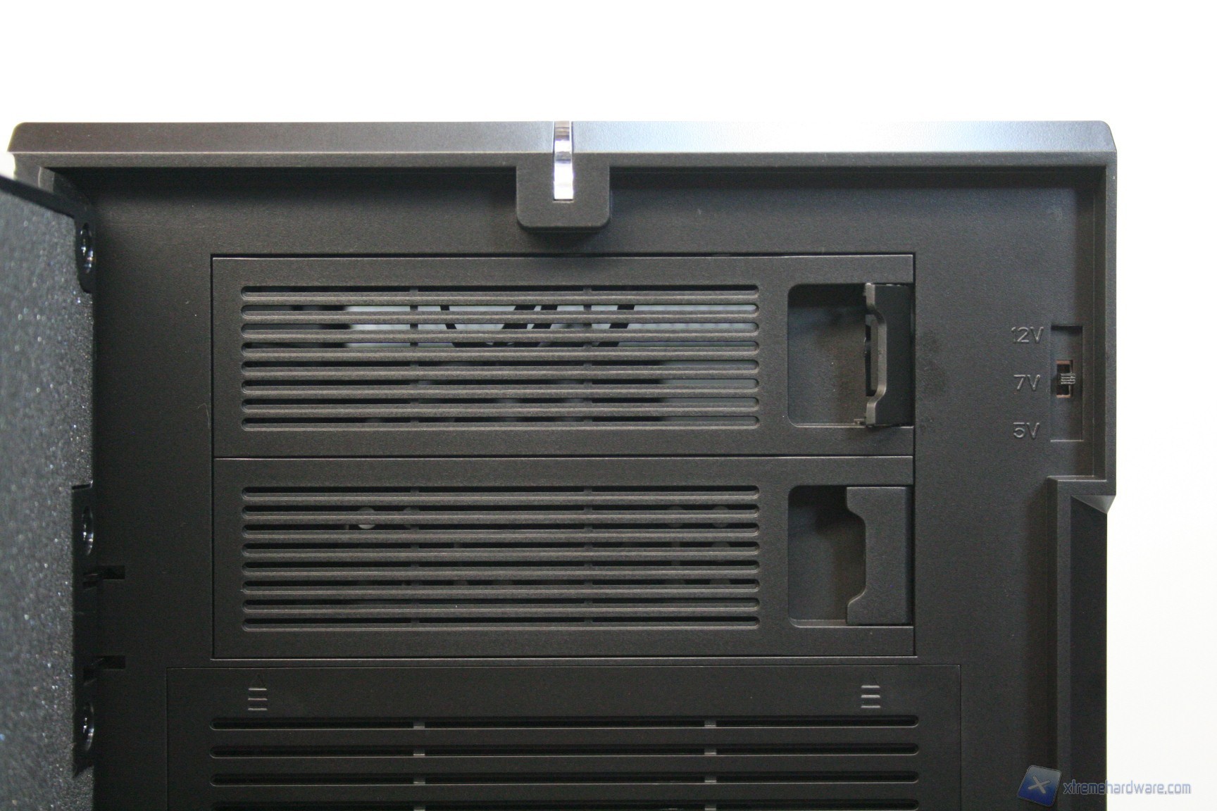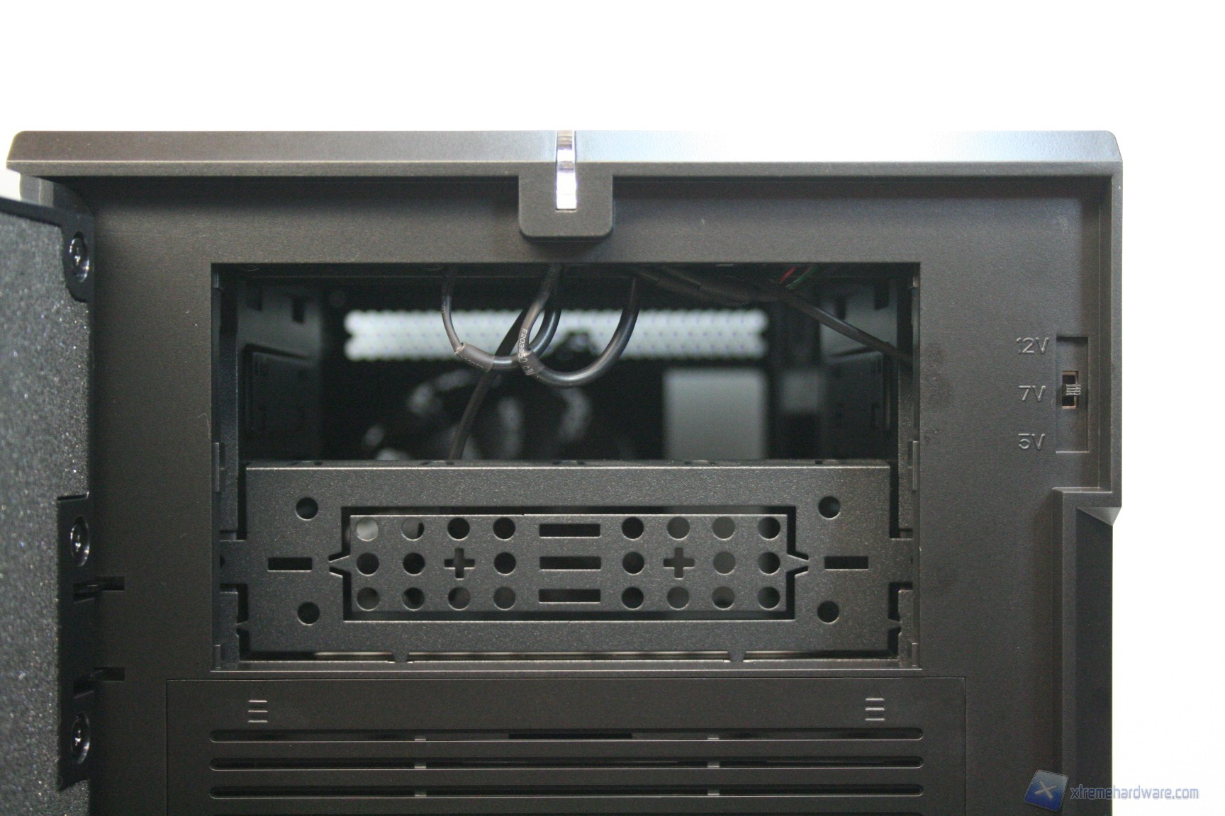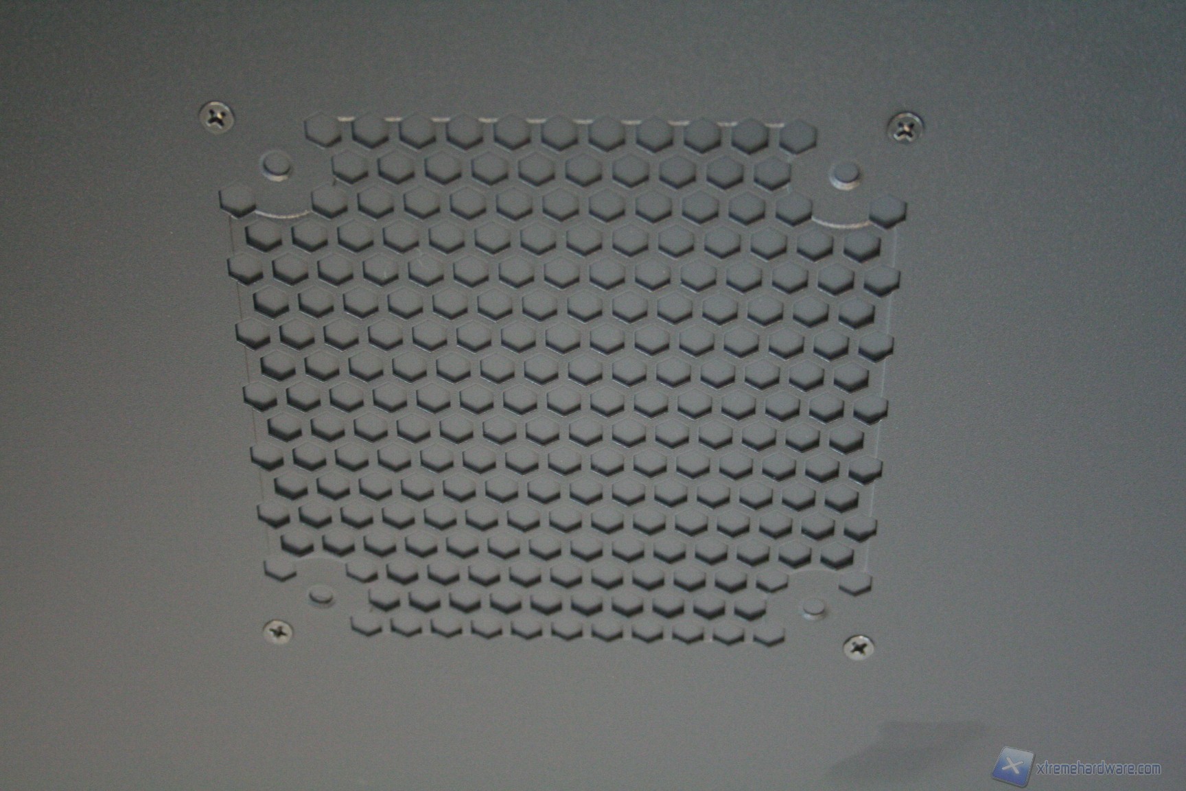 Posteriormente abbiamo una classica configurazione con alimentatore nella parte inferiore, slot di espansione che presentano aperture d’aerazione, e una paratia perforata di aerazione laterale ovvero nient’altro che un ulteriore slot PCI, per i tipici add-on come ulteriori porte USB o potenziometri per ventole. Sono assenti i fori circolari gommati per il passaggio dei cavi di sistemi a liquido però è presente uno spazio superiore con fessure esagonali che permette l’espulsione dell’aria calda superiore. La ventola è maggiorata, da 140mm, ed è posizionata in modo classico. E’ ovviamente presente la classica copertura antistatica I/O verticale. Lo spessore del cabinet è eccellente e solo questo si meriterà mezzo punto nella valutazione finale, perché è di fondamentale importanza nei cabinet moderni, per diverse ragioni: