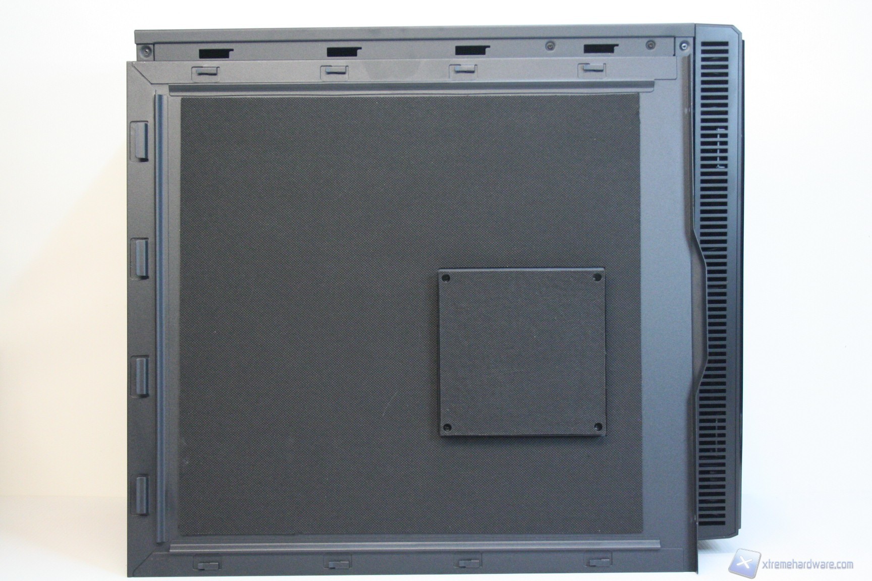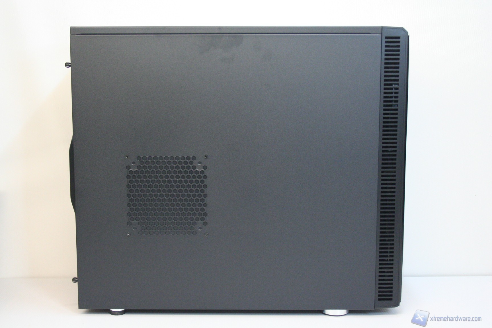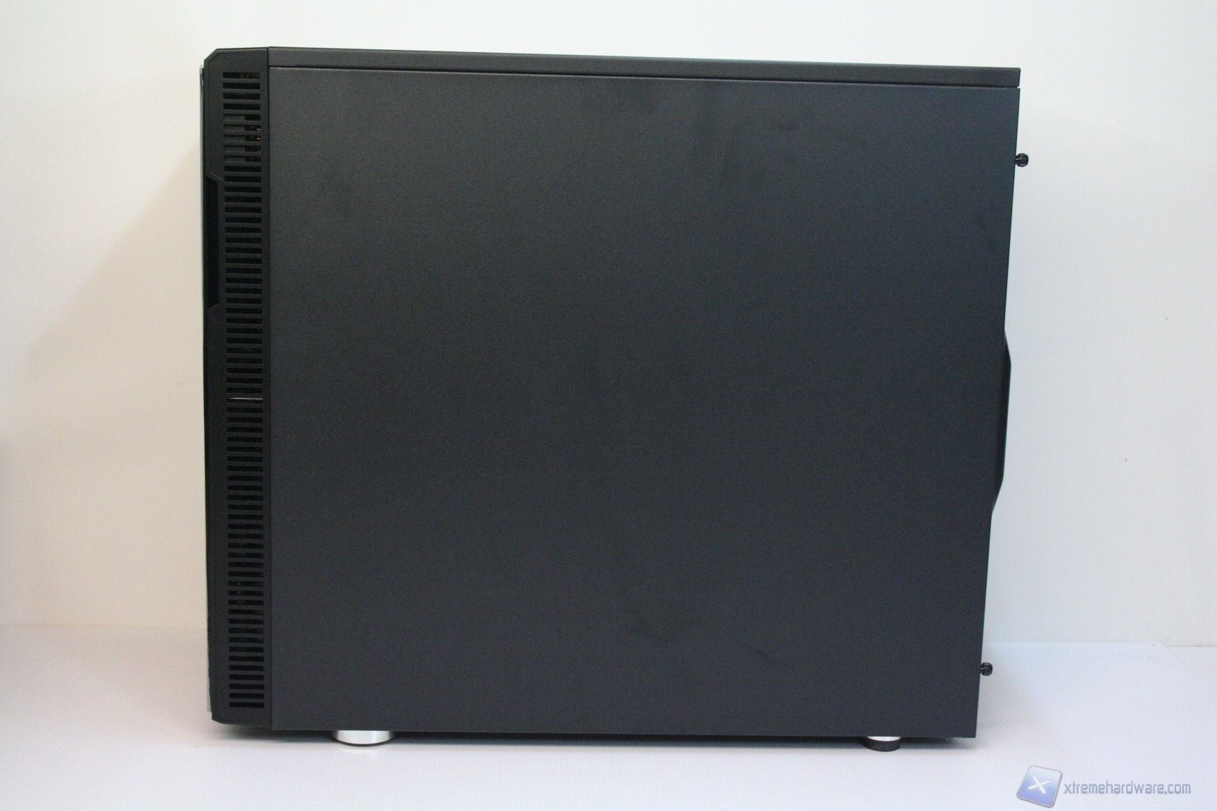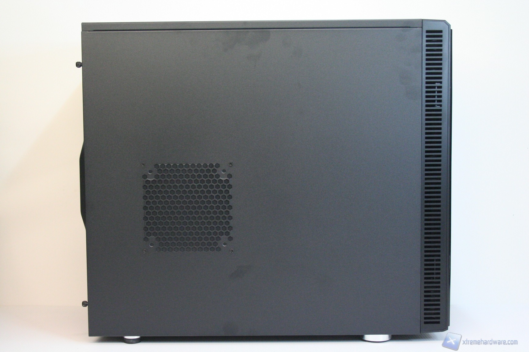 Nel lato sinistro è presente una paratia in acciaio con un foro di ventilazione, compatibile con una ventola da 120 o 140mm in immissione. Per il Define R4 esistono le corrispettive tre versioni con la paratia laterale sinistra finestrata. L’estetica complessiva è buona e nella parte destra troviamo la stessa identica struttura ad eccezione però del foro ventilato, che invece non è presente. Le paratie vengono rimosse tramite due classiche e grandi viti, svitabili a mano, di colore nero, che ben si intonano con la colorazione del case. Da notare la finitura laterale, evidente in base all’illuminazione.