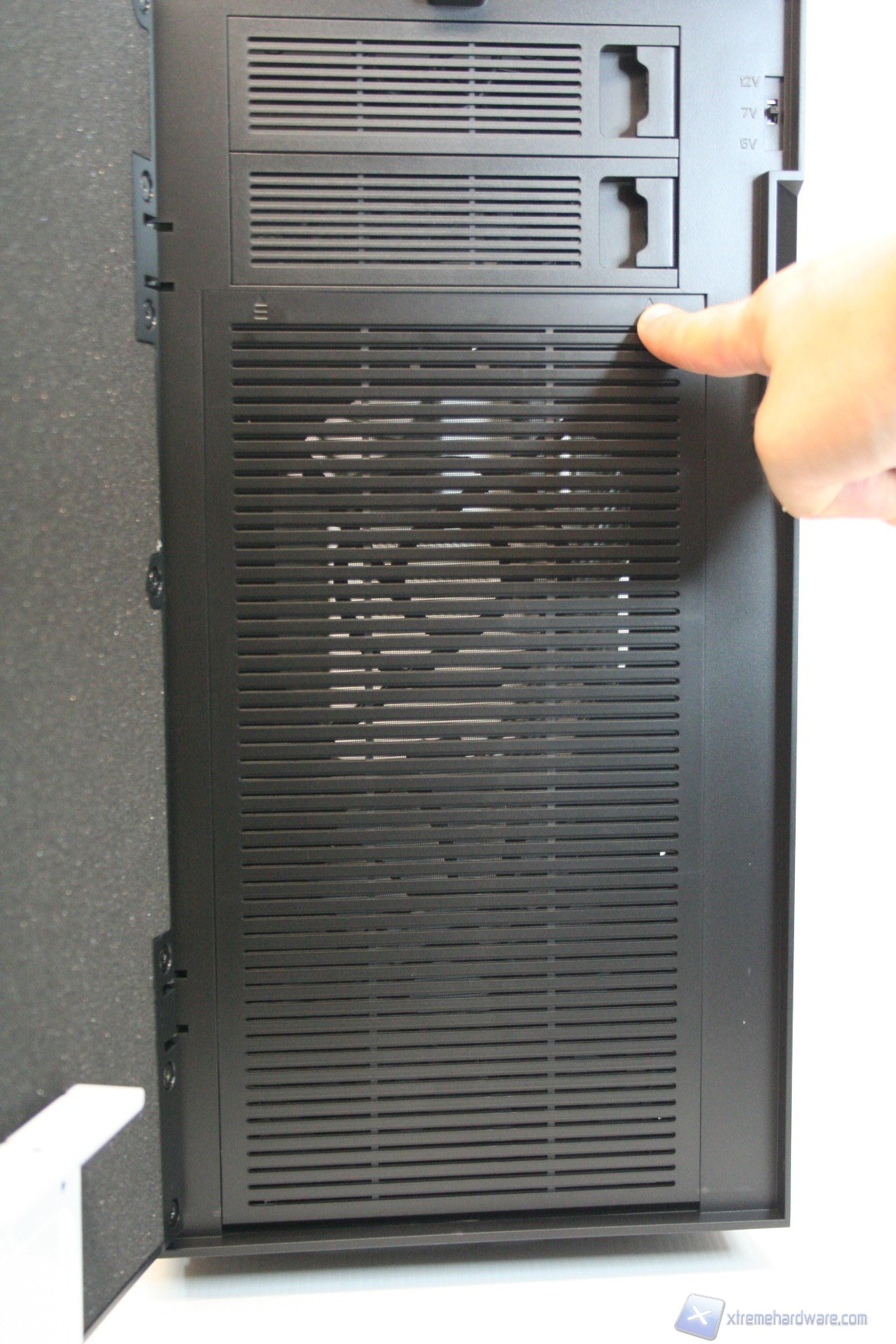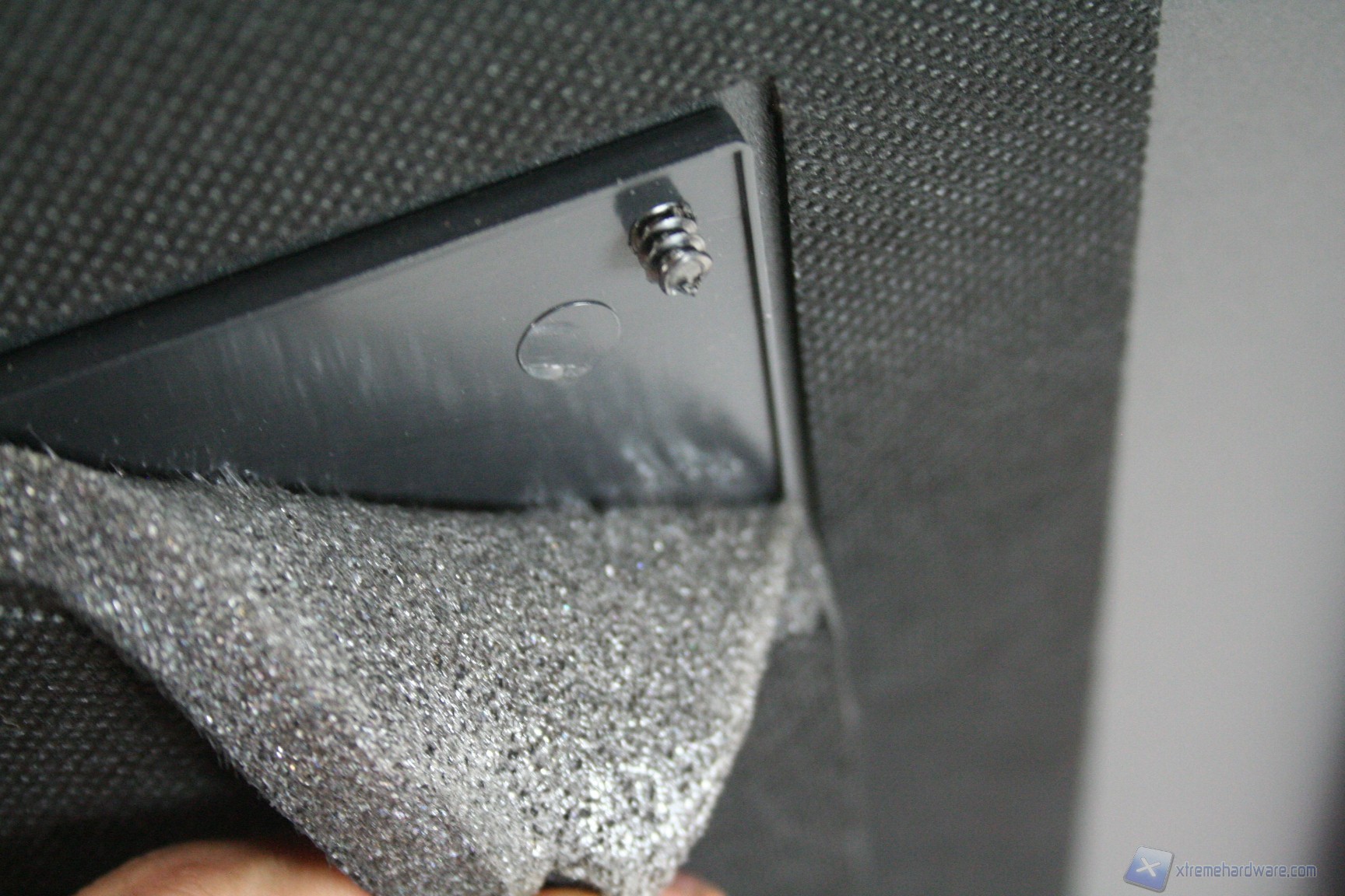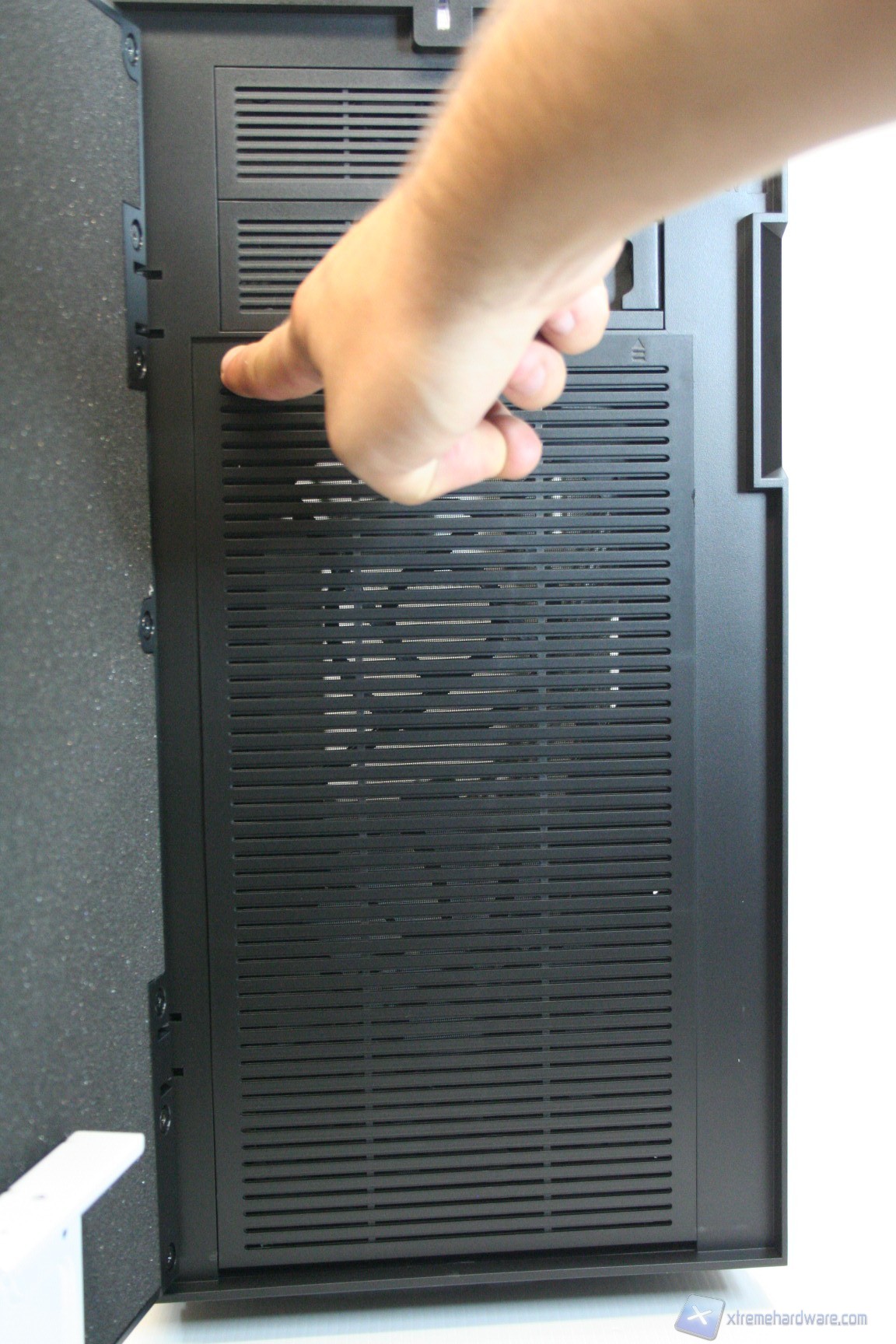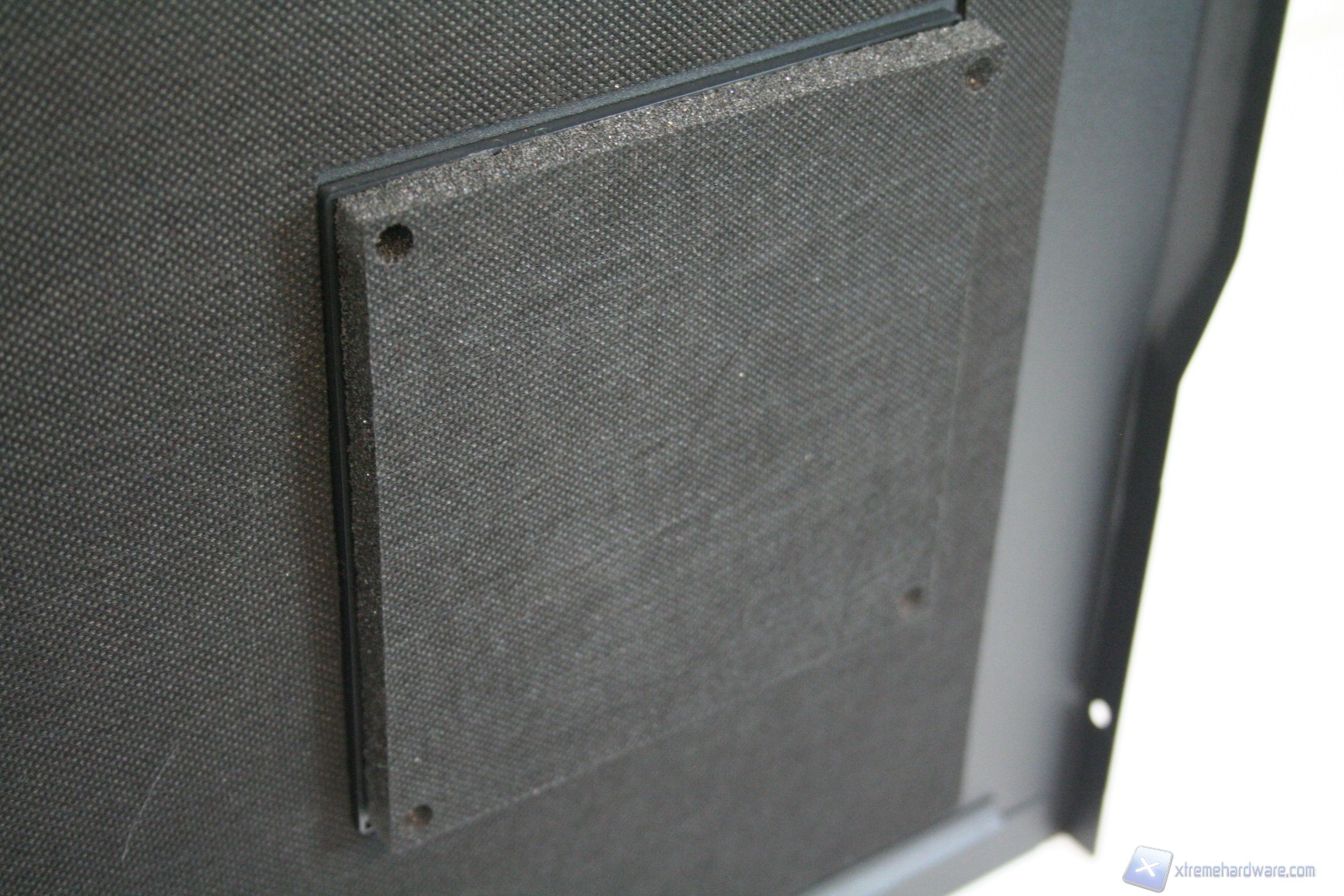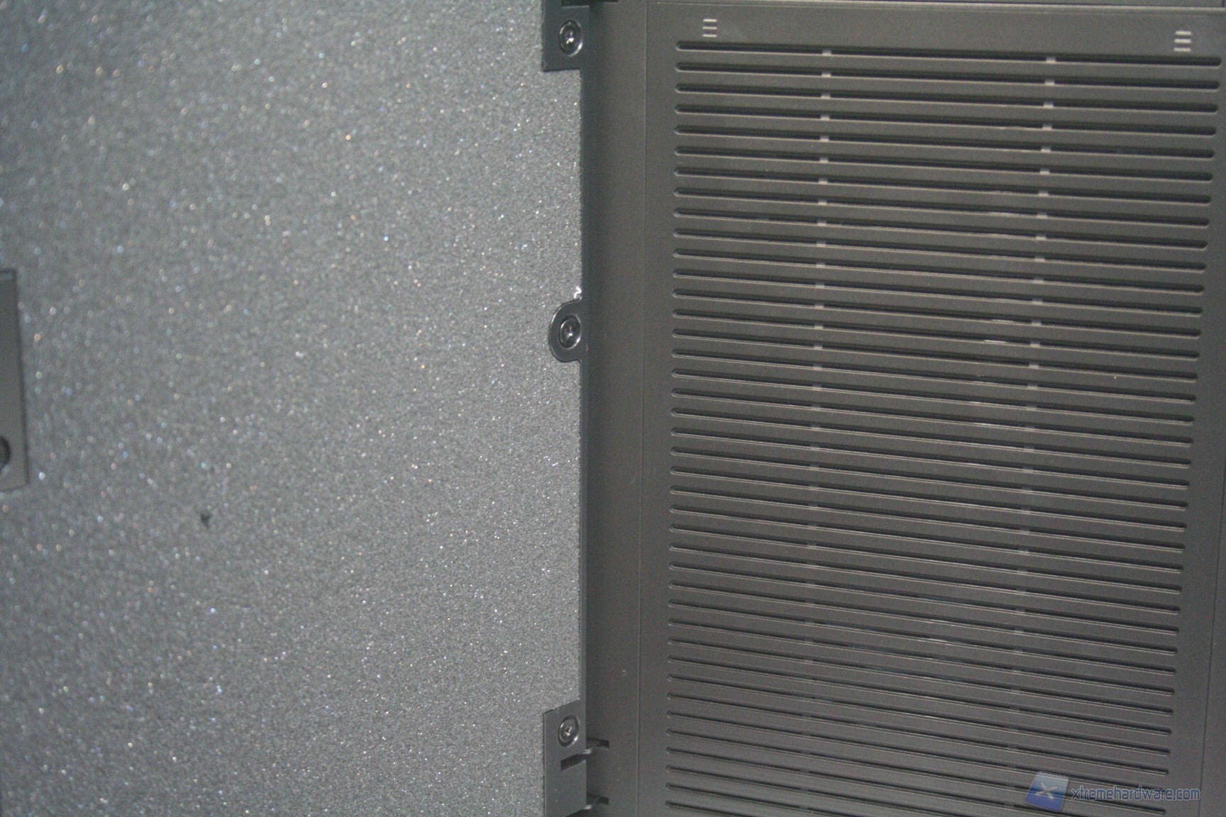 Nel lato sinistro è presente una paratia in acciaio con un foro di ventilazione, compatibile con una ventola da 120 o 140mm in immissione. Per il Define R4 esistono le corrispettive tre versioni con la paratia laterale sinistra finestrata. L’estetica complessiva è buona e nella parte destra troviamo la stessa identica struttura ad eccezione però del foro ventilato, che invece non è presente. Le paratie vengono rimosse tramite due classiche e grandi viti, svitabili a mano, di colore nero, che ben si intonano con la colorazione del case. Da notare la finitura laterale, evidente in base all’illuminazione.