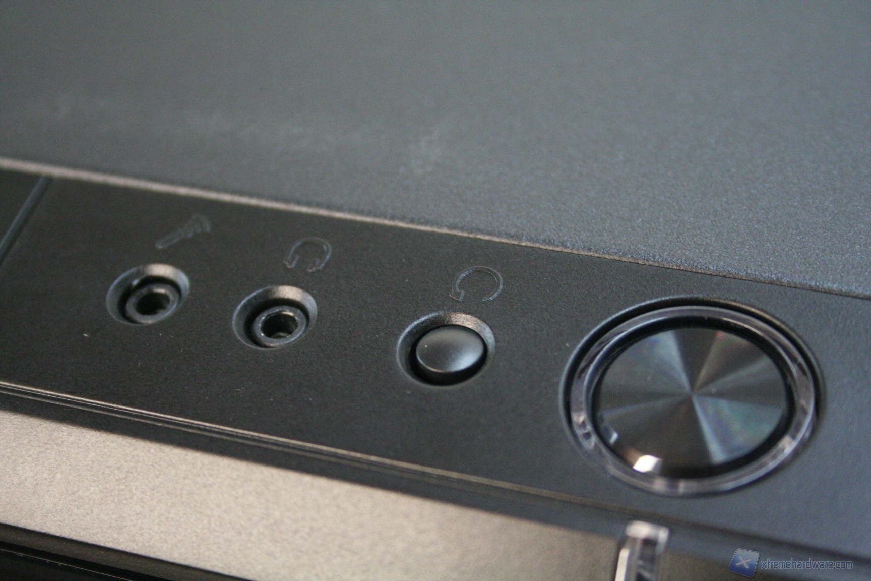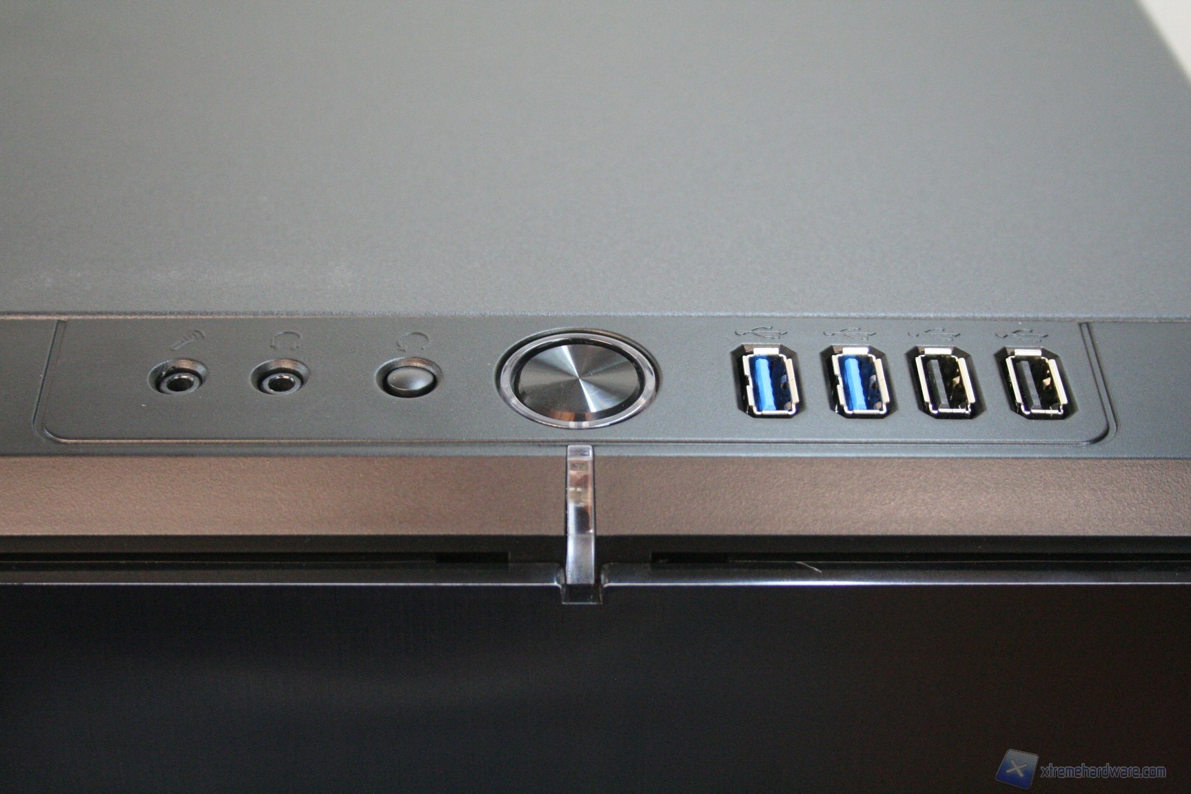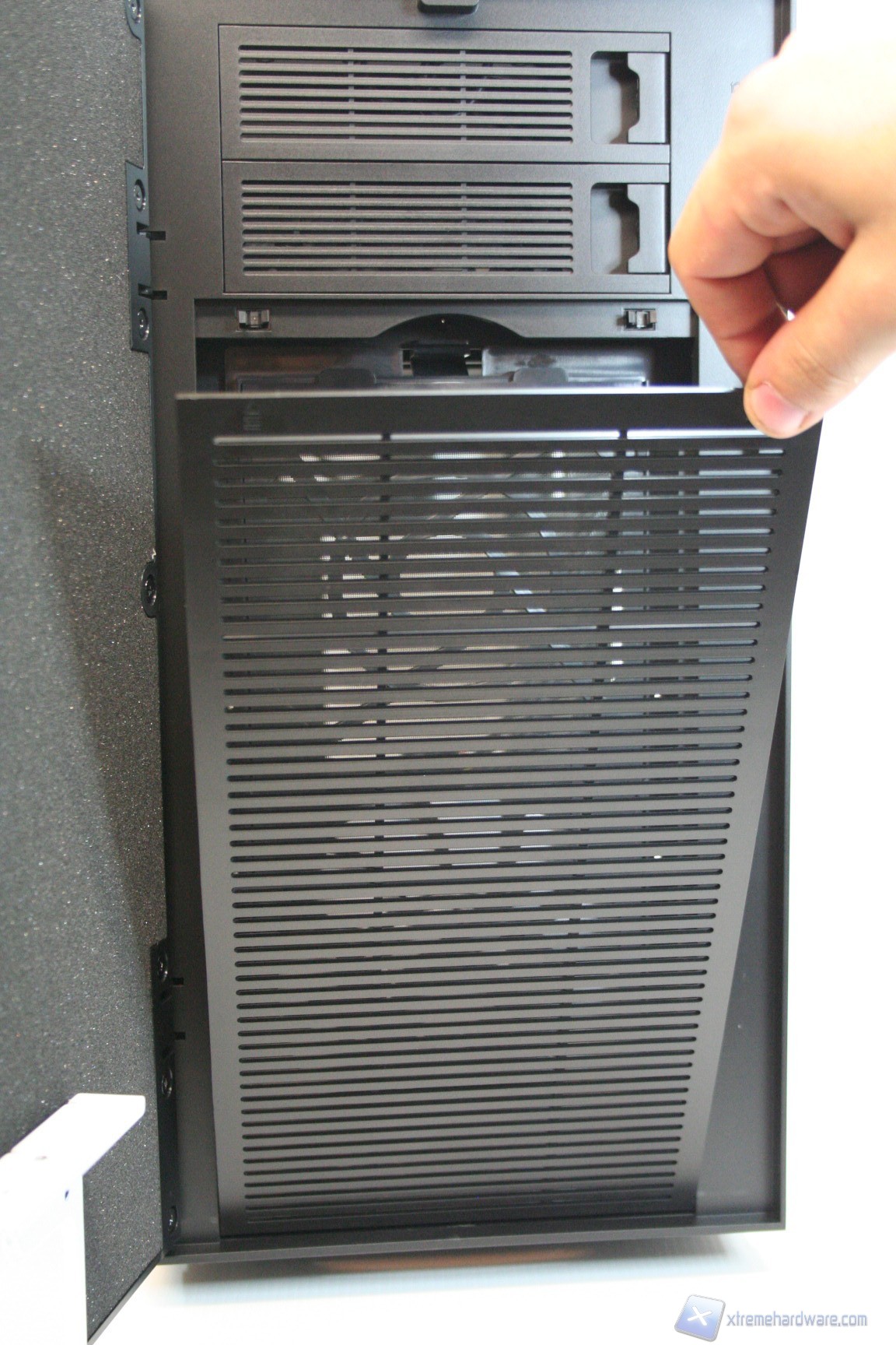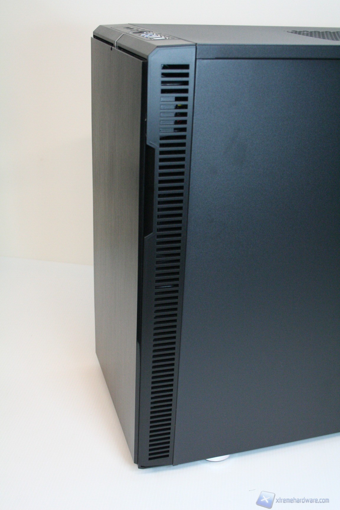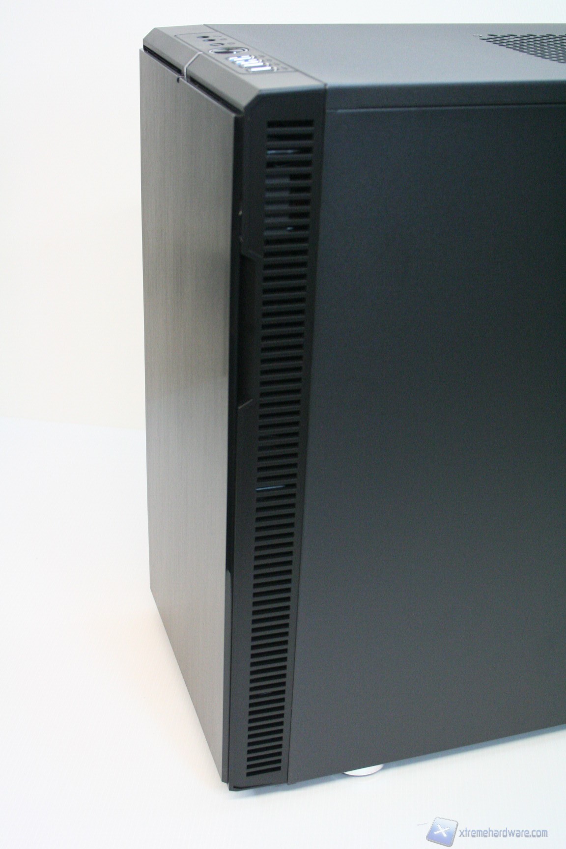Il pannello dei pulsanti è posizionato nella parte superiore. Una volta aperta la paratia frontale potrebbe sembrare riduttiva la presenza di due soli slot da 5.25” ma vedremo che saranno più che sufficienti per l‘assemblaggio di un sistema potente. Il posizionamento e l’integrazione dei coprislot da 5.25’’ è quanto di meglio si potrebbe chiedere, per via del peculiare meccanismo a sblocco laterale Fractal Design. Il frontalino presenta una finitura in alluminio spazzolato.