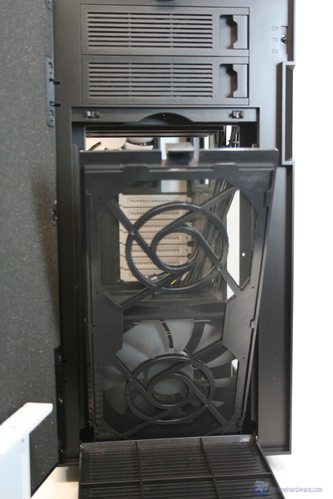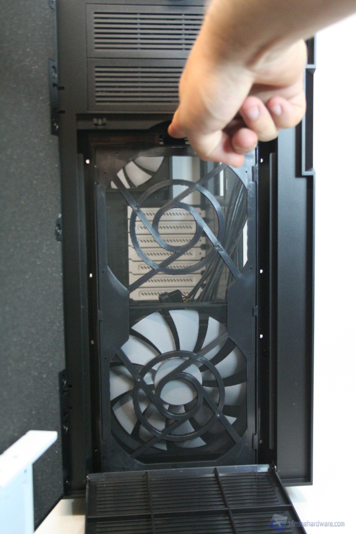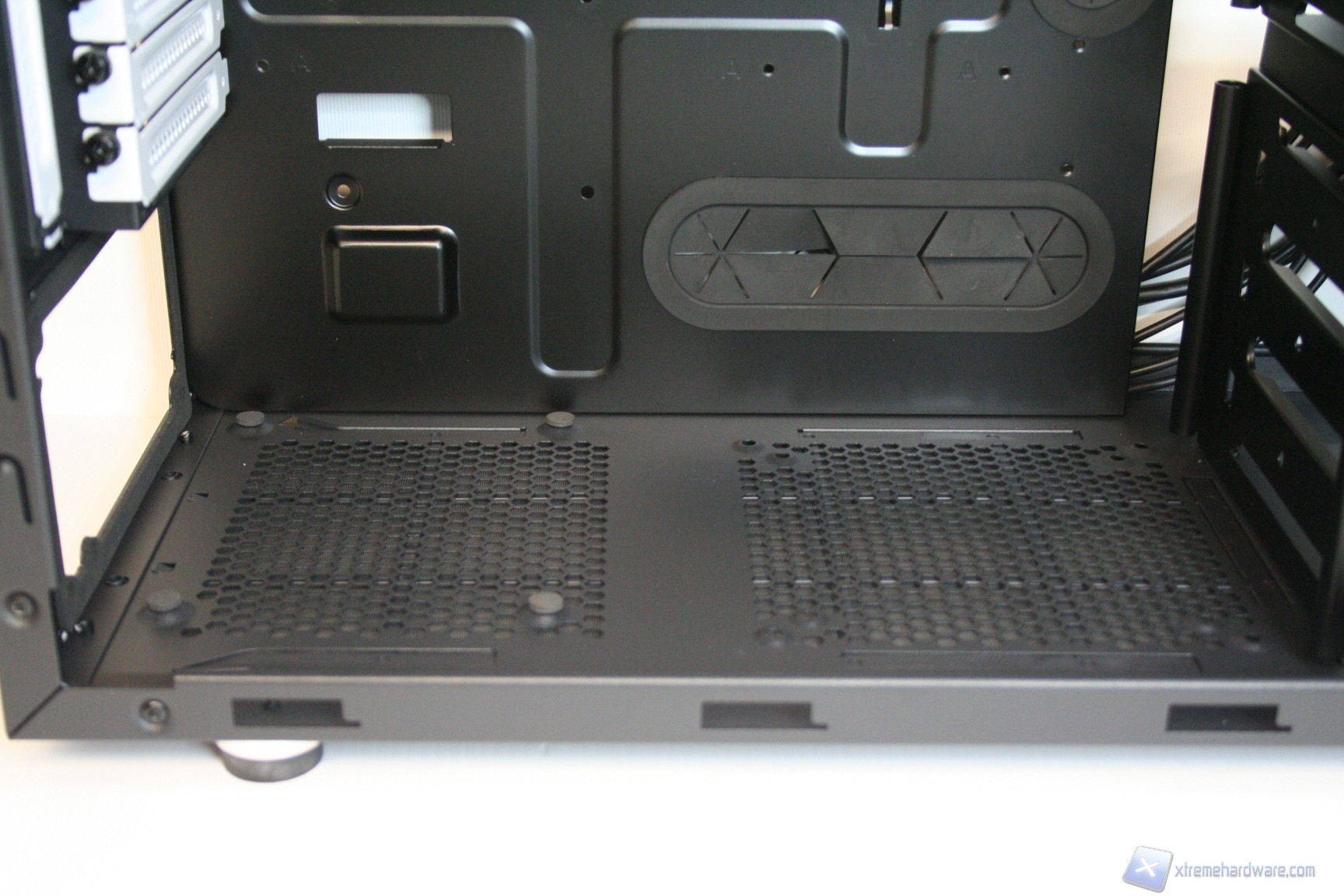 In basso abbiamo 4 ottimi supporti gommati antivibrazione, due sottili paratie ventilate con un grande filtro antipolvere estraibile, per l’alimentatore e per la ventola opzionale da 140mm. Non è possibile montare rotelle per lo spostamento del case.