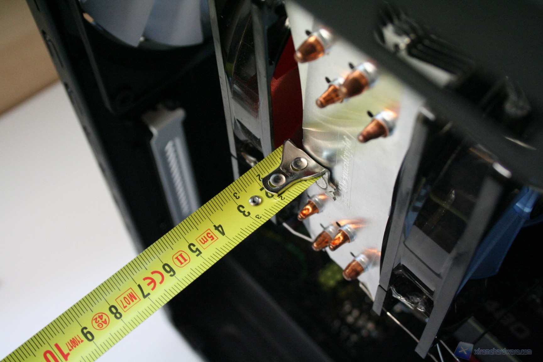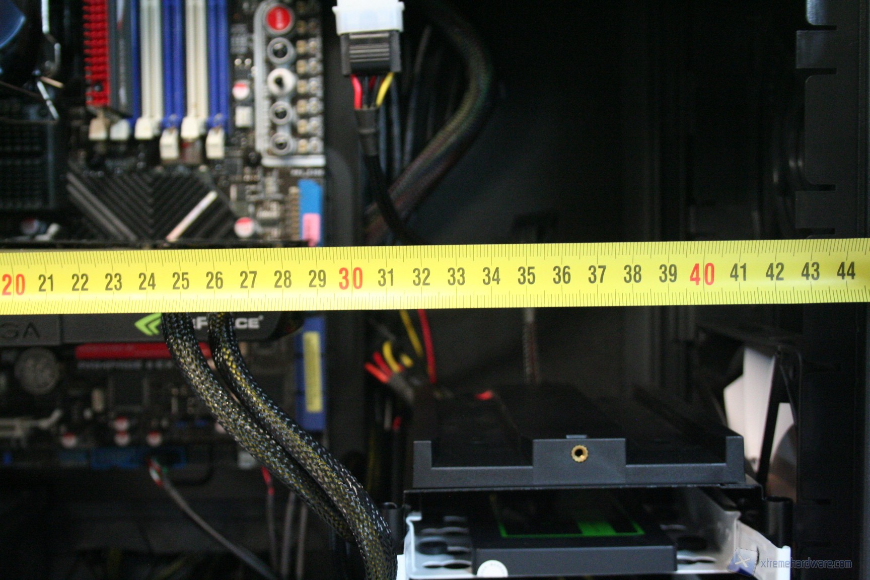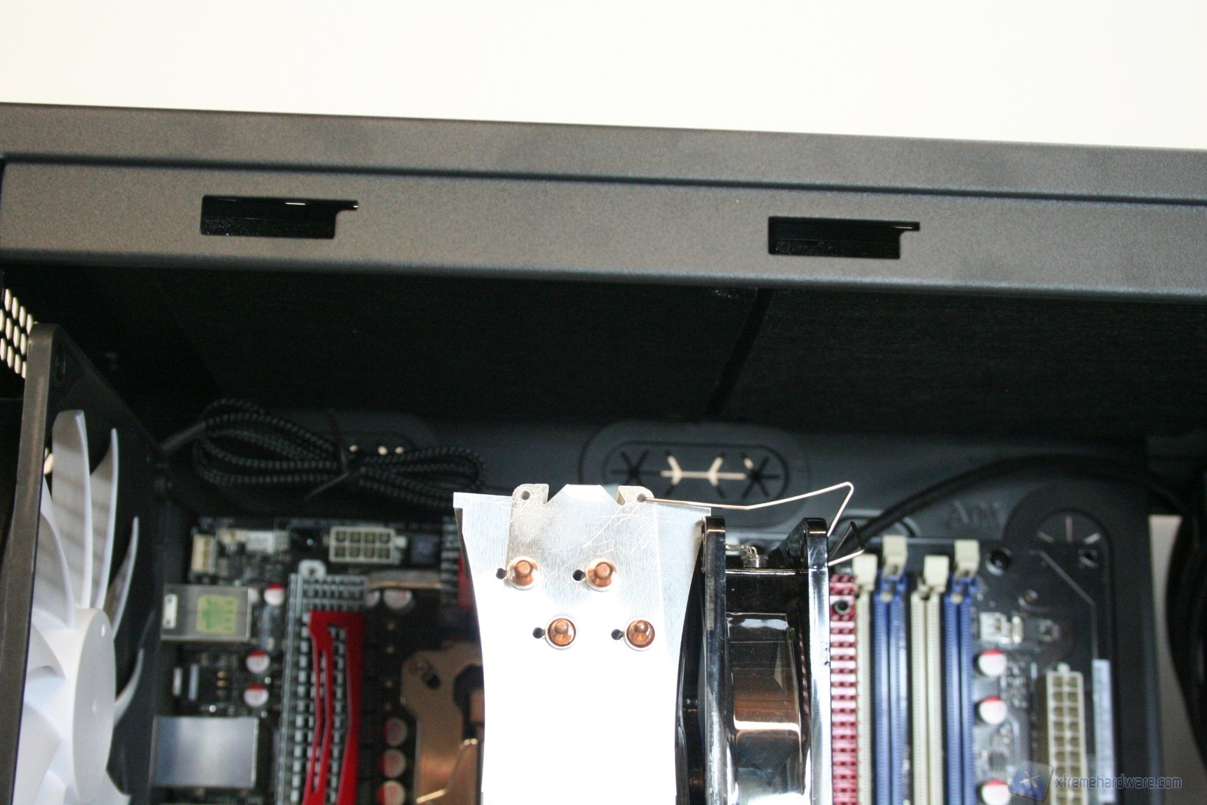 Particolare menzione va al sistema di controllo delle ventole fornito in bundle, che secondo quanto riportato nel manuale andrebbe montato nell'apposito slot PCI laterale. Consigliamo invece di montarlo nel primo slot PCI vicino alla ventola da 140mm posteriore perché così facendo questa è l'unica soluzione che permette di nascondere i cavi dietro all'apertura della scheda madre. Purtroppo nella configurazione consigliata i cavi sono troppo corti, e fondamentalmente sarebbe anche antiestetica. Terminata l’operazione vi consigliamo di connettere tutte le ventole del cabinet, che potrete cablare direttamente dietro alla paratia di installazione della scheda madre vicino all'apertura posteriore della CPU. Fatto questo bisogna connettere le ventole del dissipatore, fare un check dei cavi Sata, di alimentazione delle varie periferiche ed infine quelli sulla scheda madre. Ecco qui come si presenterà il case a lavoro terminato. Al fine della misurazione riportiamo il posizionamento del sensore di temperatura, posizionato direttamente sopra ai due cage degli hard disk.