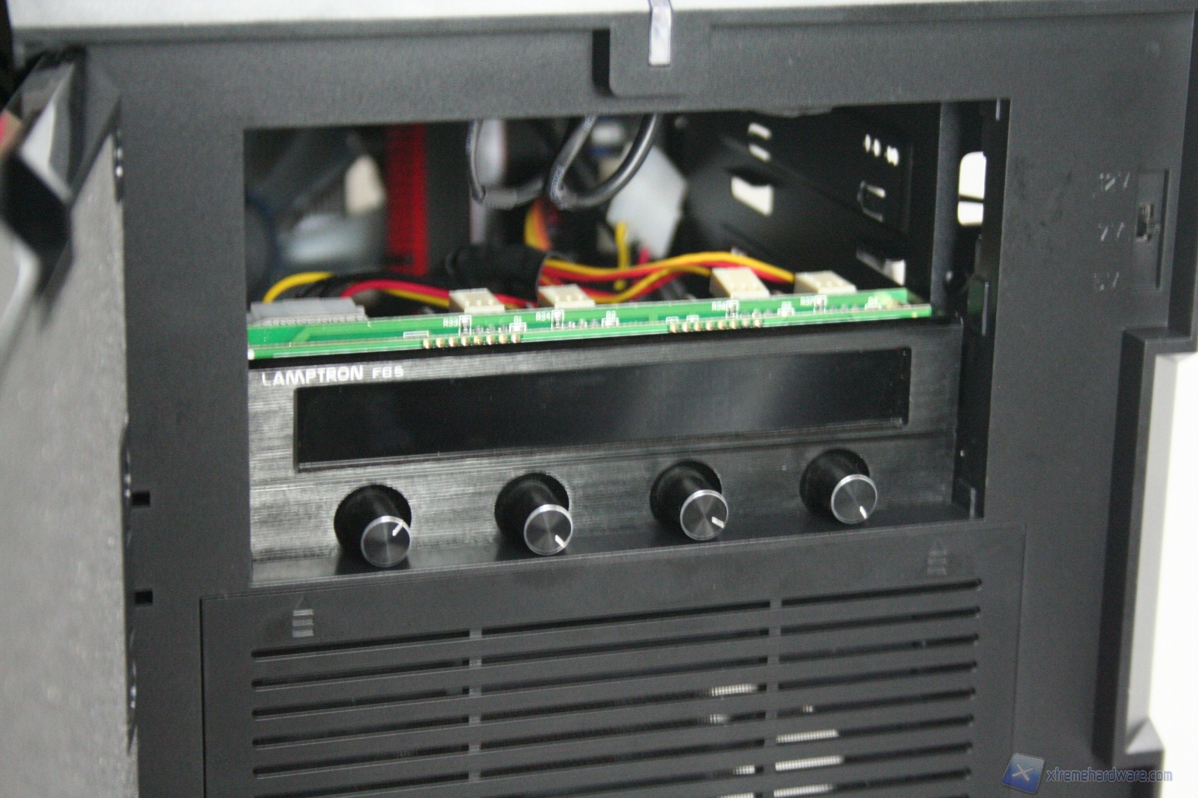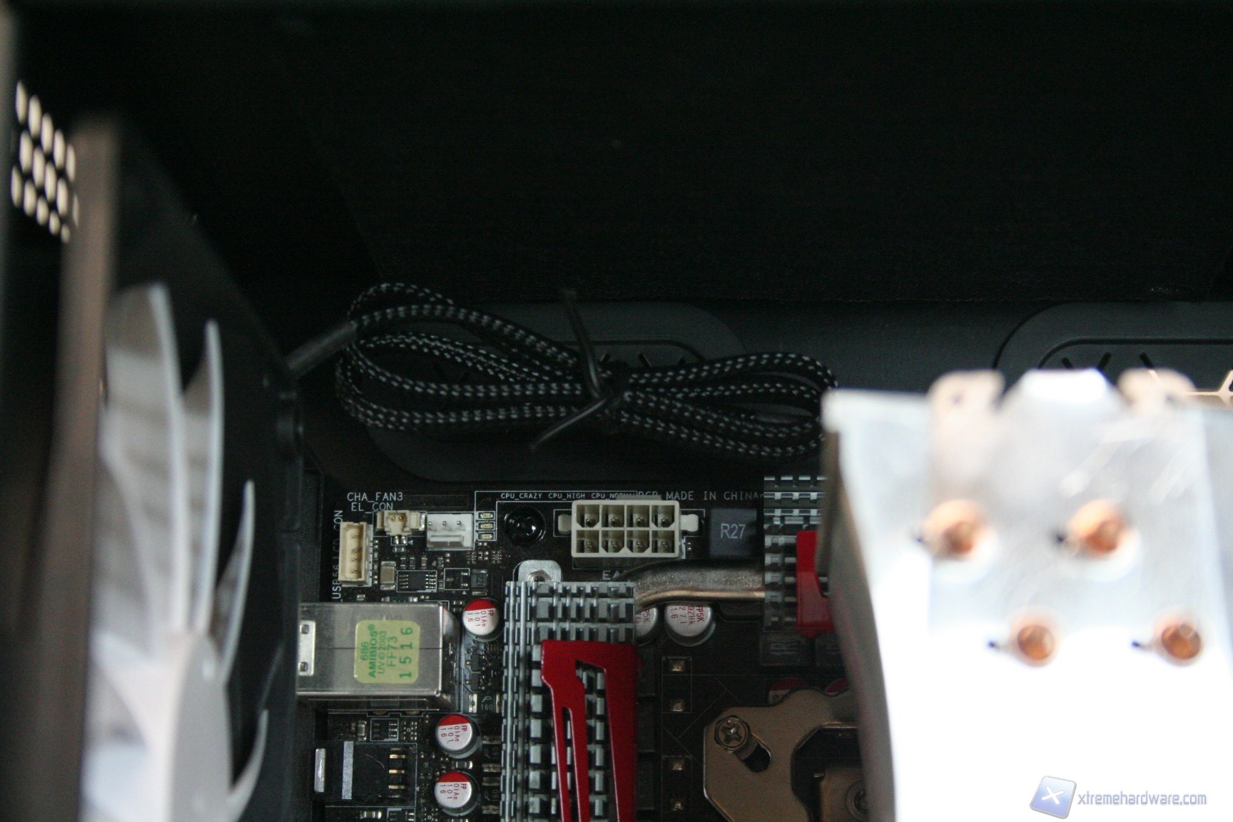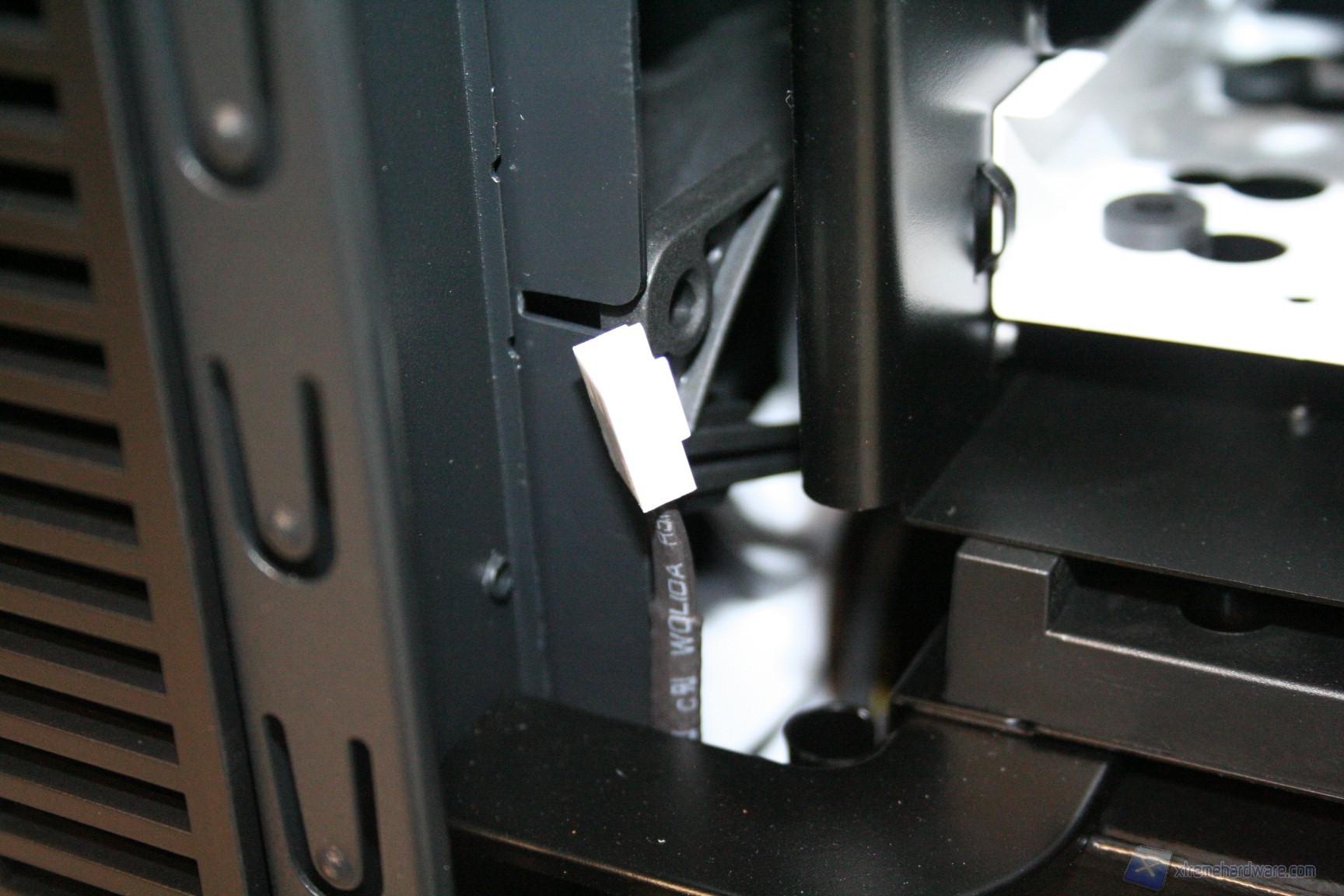 Particolare menzione va al sistema di controllo delle ventole fornito in bundle, che secondo quanto riportato nel manuale andrebbe montato nell'apposito slot PCI laterale. Consigliamo invece di montarlo nel primo slot PCI vicino alla ventola da 140mm posteriore perché così facendo questa è l'unica soluzione che permette di nascondere i cavi dietro all'apertura della scheda madre. Purtroppo nella configurazione consigliata i cavi sono troppo corti, e fondamentalmente sarebbe anche antiestetica. Terminata l’operazione vi consigliamo di connettere tutte le ventole del cabinet, che potrete cablare direttamente dietro alla paratia di installazione della scheda madre vicino all'apertura posteriore della CPU. Fatto questo bisogna connettere le ventole del dissipatore, fare un check dei cavi Sata, di alimentazione delle varie periferiche ed infine quelli sulla scheda madre. Ecco qui come si presenterà il case a lavoro terminato. Al fine della misurazione riportiamo il posizionamento del sensore di temperatura, posizionato direttamente sopra ai due cage degli hard disk.