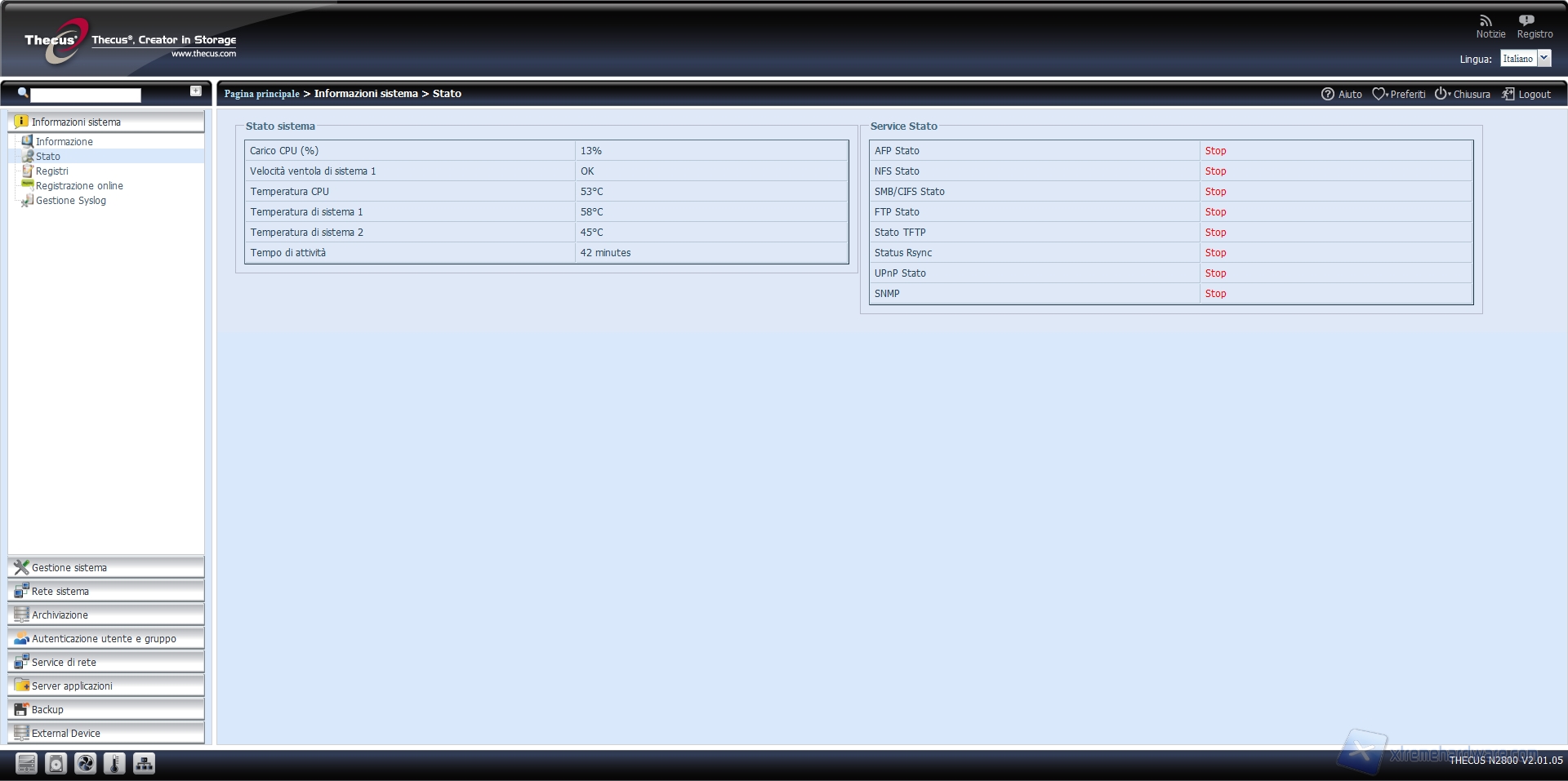 La voce “Stato” permette di monitorare lo stato del sistema, come ad esempio l’utilizzo della CPU e le relative temperature, il tempo di attività e, aspetto importante, permette di visualizzare quali servizi son attivati e quali non lo sono.
