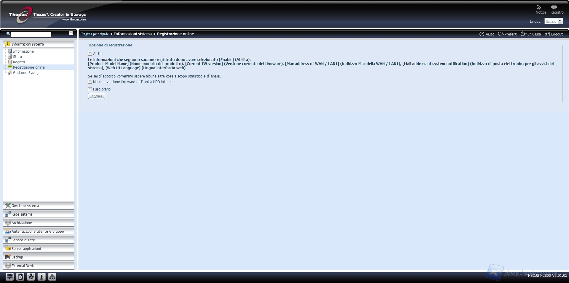 “Registrazione online” esegue l’invio, se abilitato, di informazioni relative alla marca ed al firmware dei dischi installati nel sistema e del fuso orario semplicemente con scopo statistico.